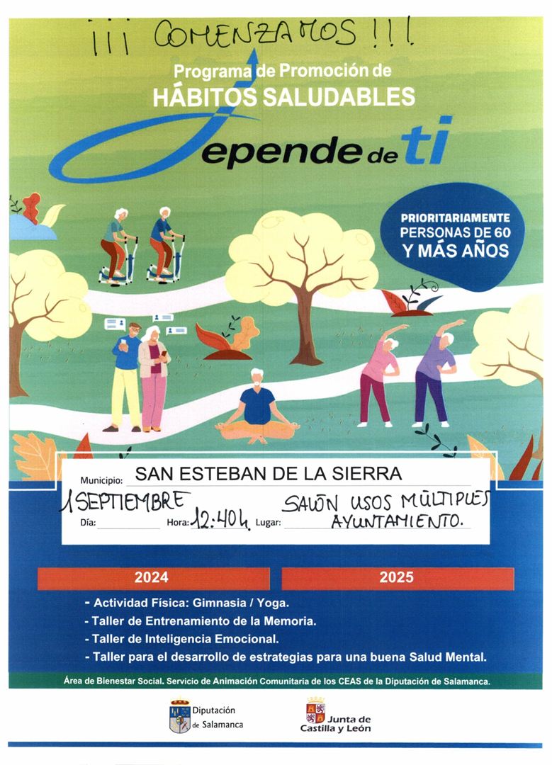 Cursos y actividadesGeneralServiciosAsociaciónLocalBandos COMIENZA EL PROGRAMA "DEPENDE DE TÍ" EN SAN ESTEBAN DE LA SIERRA Hace 4 meses ANIMAROS!! SERÁ LOS LUNES Y MIÉRCOLES A PARTIR DEL PRÓXIMO LUNES DÍA 1 DE SEPTIEMBRE. PREFERENTE PARA MAYORES DE 60 AÑOS PERO PUEDEN ACUDIR TAMBIÉN MENORES DE ESA EDAD.