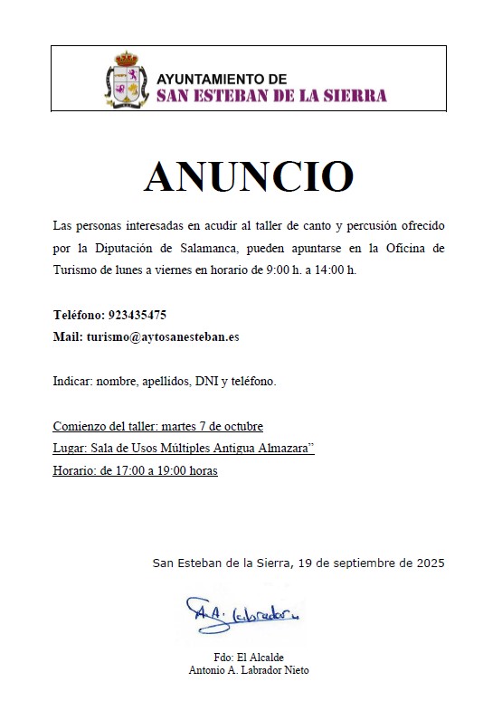 Cursos y actividadesGeneralLocalBandos CURSO DE CANTO Y PERCUSIÓN EN SAN ESTEBAN DE LA SIERRA Hace 3 meses