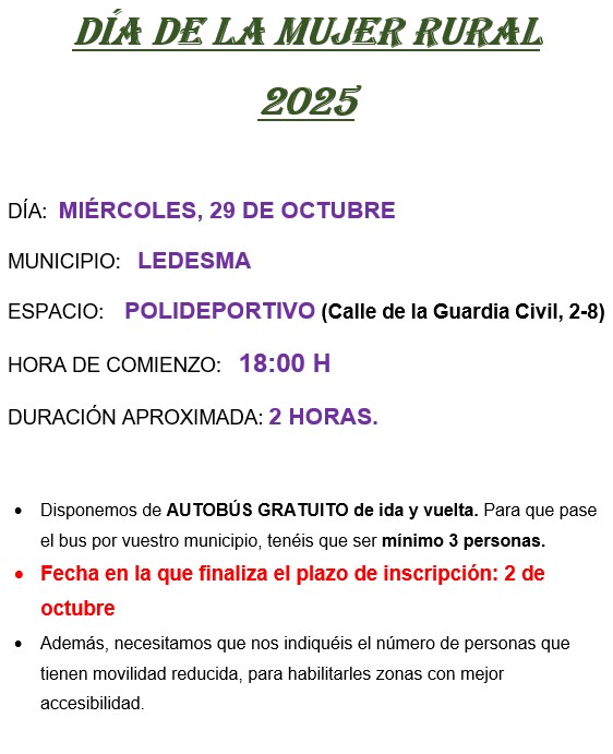 LAS PERSONAS INTERESADAS EN ACUDIR AL ACTO INSTITUCIONAL POR EL DIA DE LA MUJER RURAL QUE SE CELEBRARÁ EL 29 DE OCTUBRE EN LEDESMA, PUEDEN INSCRIBIRSE EN LA OFICINA DE TURISMO. SOLAMENTE HABRÁ AUTOBÚS SI SE APUNTAN MÁS DE 3 PERSONAS.
