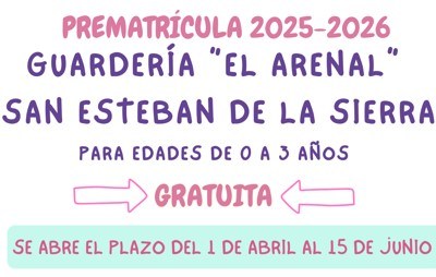 General Local Servicios ABIERTO EL PLAZO DE MATRÍCULA EN LA GUARDERÍA EL ARENAL DE SAN ESTEBAN DE LA SIERRA Hace 1 año